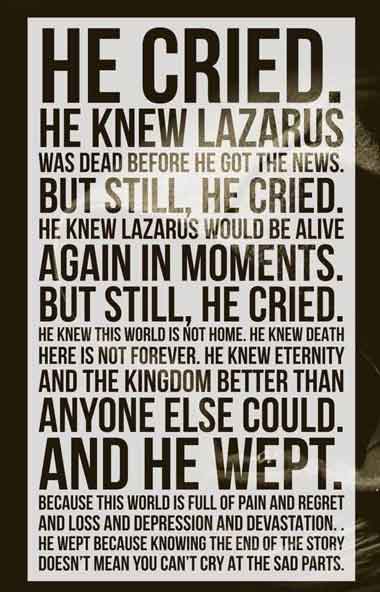 toch, Hij weende. Hij wist dat Lazarus spoedig opnieuw tot leven zou komen,